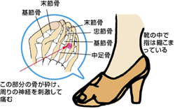 指上げ歩きは靴の中で足先がZ字形となり、上下から圧迫される格好で収まっているため、中足骨の骨頭部分がクッション無しに地面に打ち付けられることになります。これを1日何万回と繰り返してしまうため、骨頭部分の軟骨が破壊されたり、変形してトゲのようになり、これが歩く度にまわりの神経を圧迫・刺激するため、様々な症状を起こしているのです。